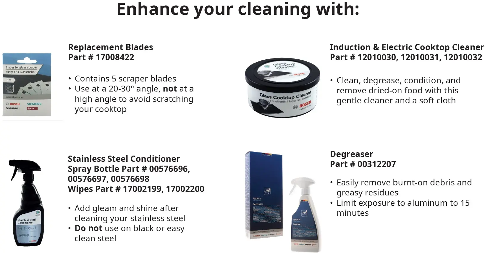 Use scraper at a shallow angle (such as 20 or 30 degrees) with smooth movements to avoid scratching the glass cooktop. DO NOT use at a high angle (such as 45 or 90 degrees) or stabbing movements, doing so might scratch the glass cooktop